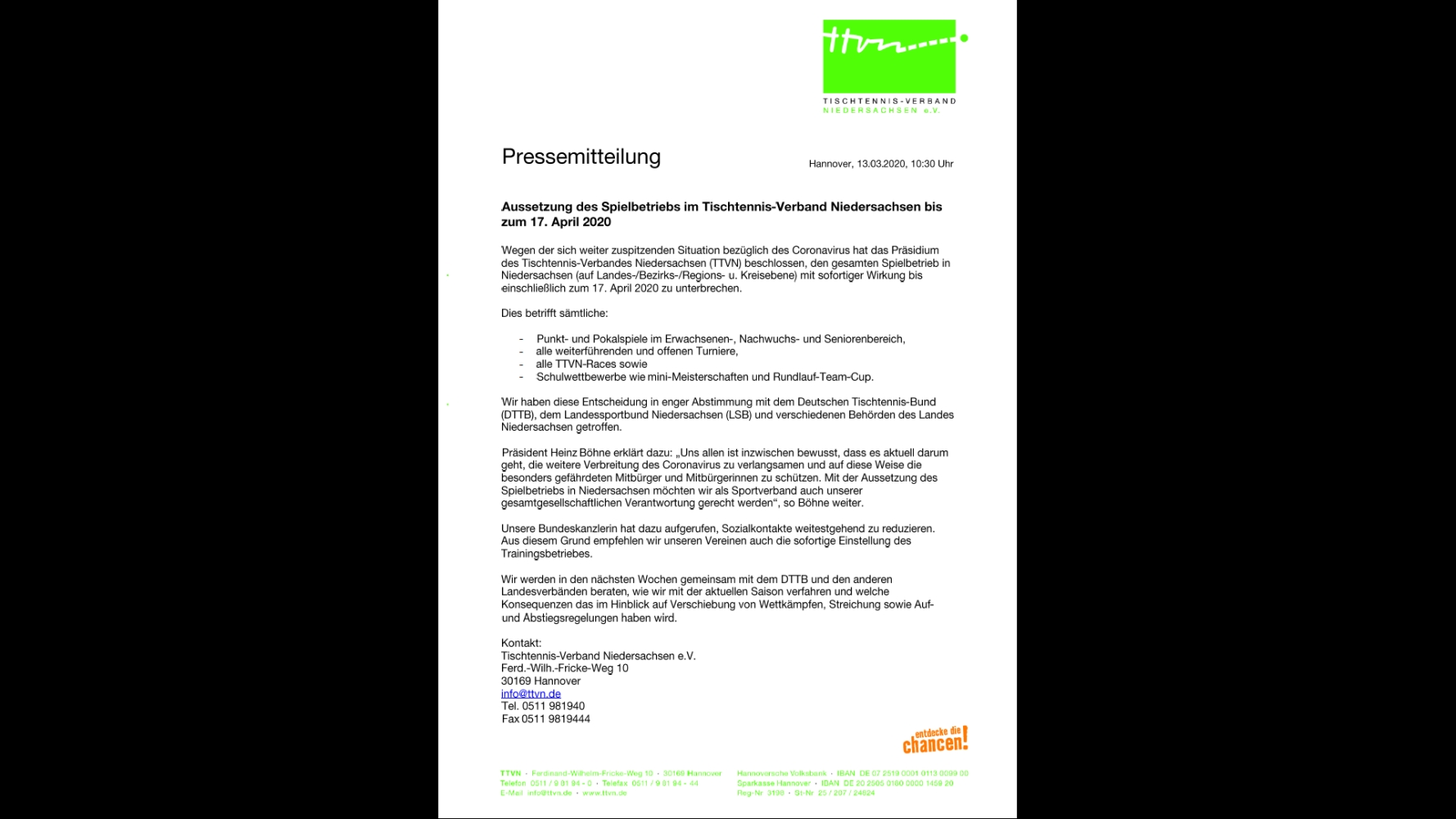 Aufgrund der rasanten Entwicklung der letzten Tage haben DTTB und TTVN heute beschlossen, den kompletten Spielbetrieb auf allen Ebenen ab sofort und bis zum 17. April ruhen zu lassen. Die dazugehörige Pressemitteilung des TTVN könnt ihr durch einen Klick auf das Bild vergößern oder hier herunterladen. Wir werden euch zeitnah über die Konsequenzen für das Saisonende und die Auf- und Abstiegsregelungen informieren, sobald wir die entsprechenden Infos seitens des TTVN vorliegen haben.